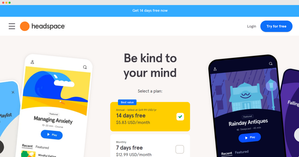 In questo ulteriore esempio, dal sito Headspace, società online inglese-americana, specializzata in corsi di meditazione, la chiamata all’azione non è solo “scegli un piano”, ma è “Sii gentile con la tua mente: Be kind to your mind“.