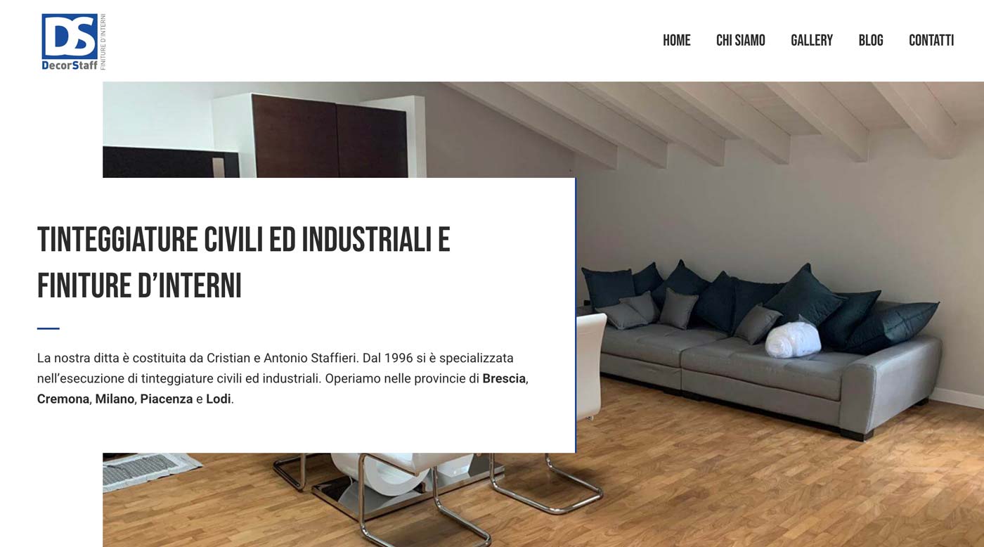 Dal 1996, Decor Staff si è specializzata nell’esecuzione di tinteggiature civili ed industriali. Opera nelle provincie di Brescia, Cremona, Milano, Piacenza e Lodi. L’attività viene svolta con l’ausilio di moderne tecnologie, dei migliori materiali e delle tecniche più avanzate, con particolare riguardo all’ambiente utilizzando materiali naturali di alta qualità.